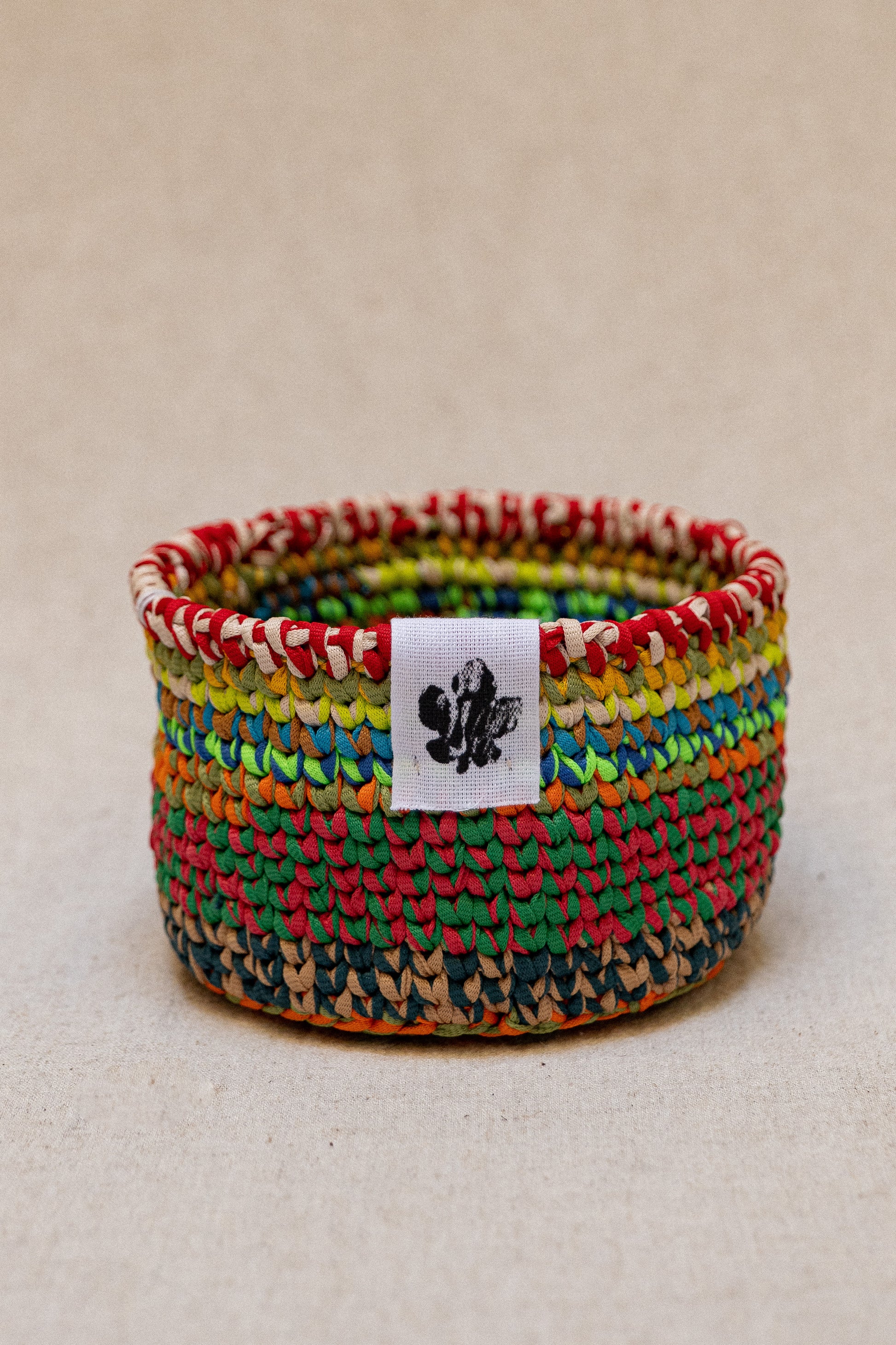 Aggiungi vivacità al tuo spazio con questo cestino portaoggetti tondo basso in poliestere multicolore. Lavorato a uncinetto, è ideale per organizzare oggetti di medie dimensioni con un tocco di colore e creatività.