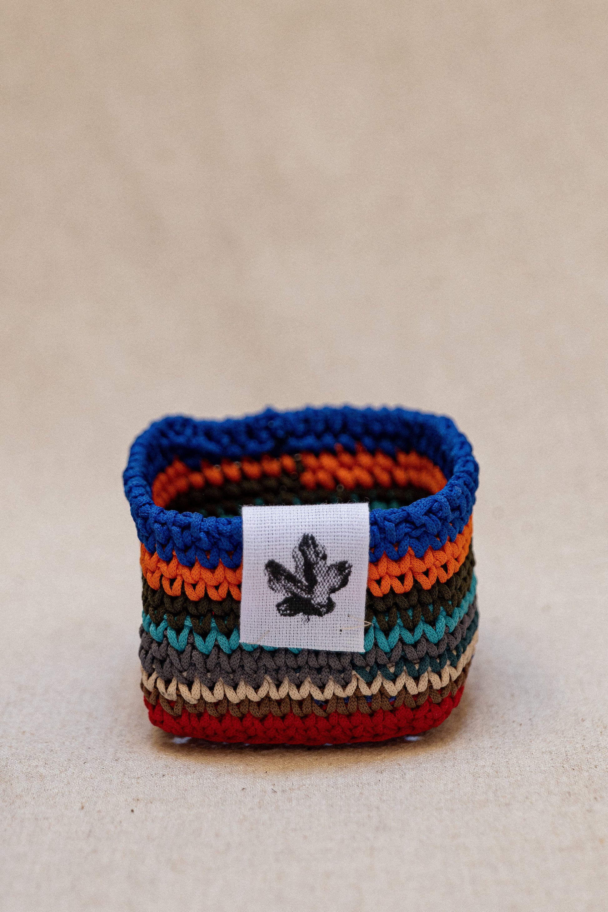 Perfetto per piccoli spazi, questo cestino quadrato basso in poliestere multicolore è l'accessorio ideale per tenere in ordine i tuoi oggetti con stile. Realizzato a uncinetto, unisce funzionalità e vivacità in un design compatto.