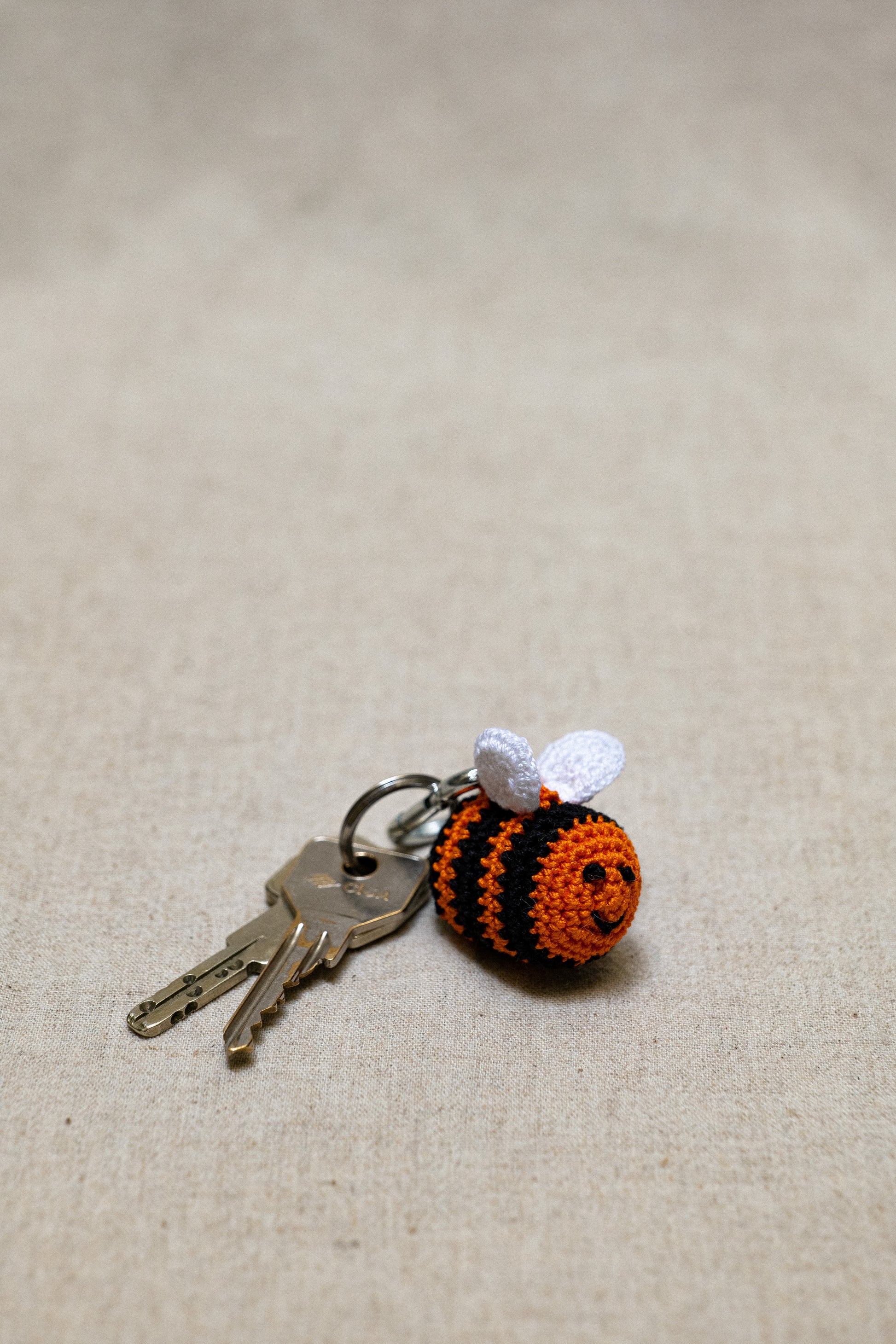 Portachiavi a uncinetto raffigurante un'ape, realizzato con la tecnica amigurumi. Creato con un mix di filati, questo portachiavi è un accessorio divertente e colorato, ideale da attaccare a borse o chiavi.