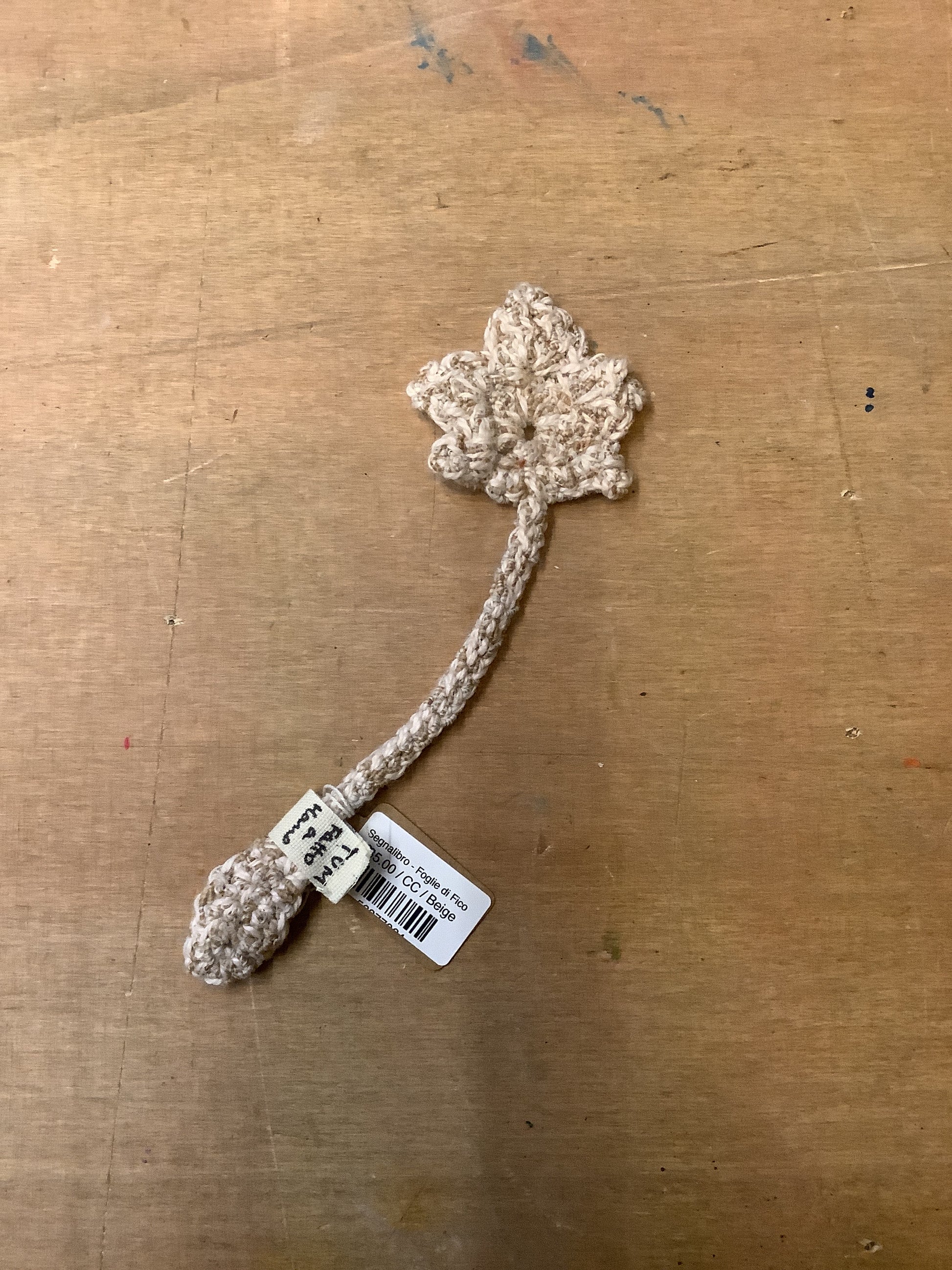 Segnalibro a uncinetto con una graziosa foglia di fico, realizzato a mano. La lunghezza di 20 cm lo rende ideale per accompagnare la lettura con un tocco naturale.