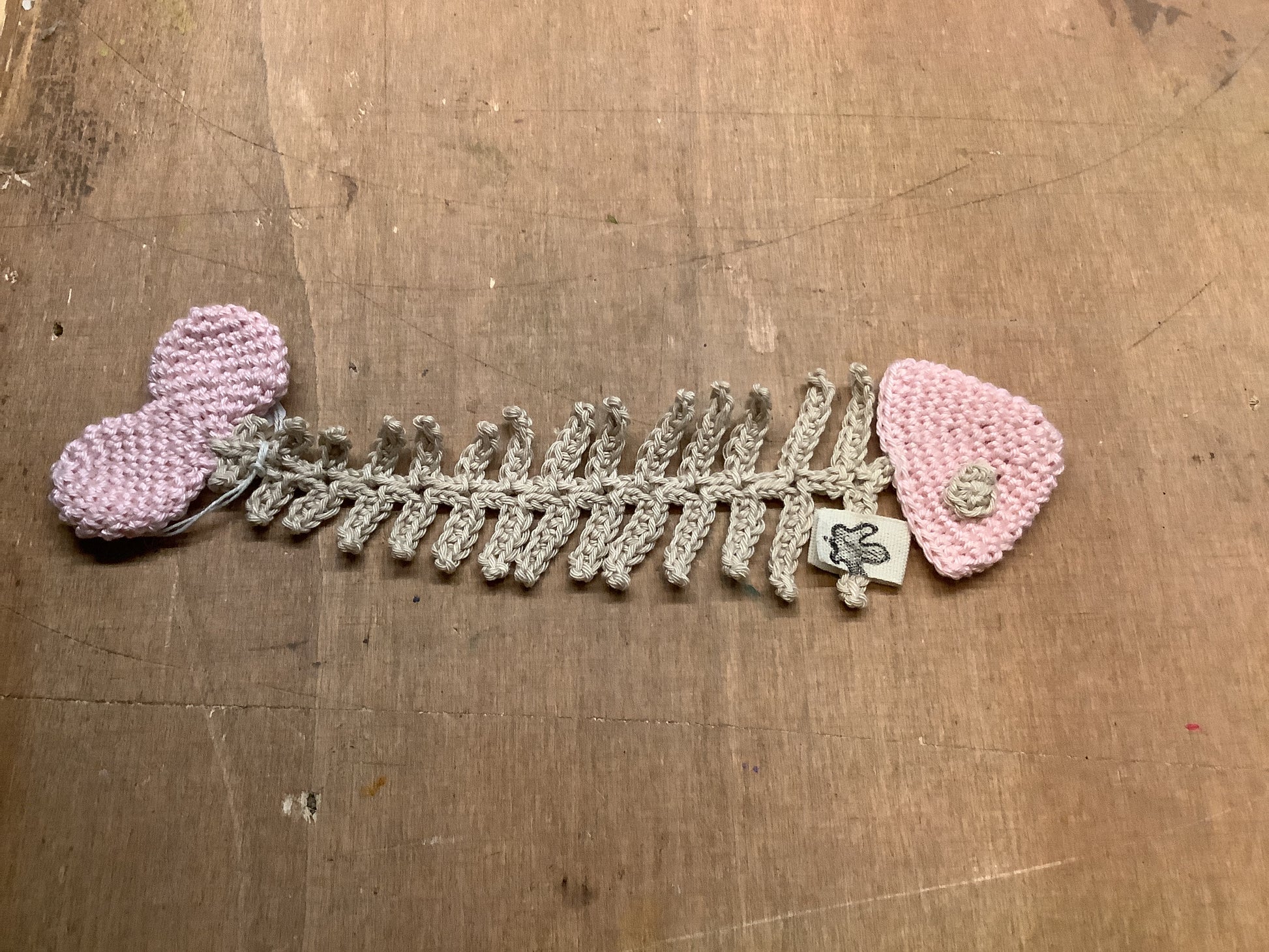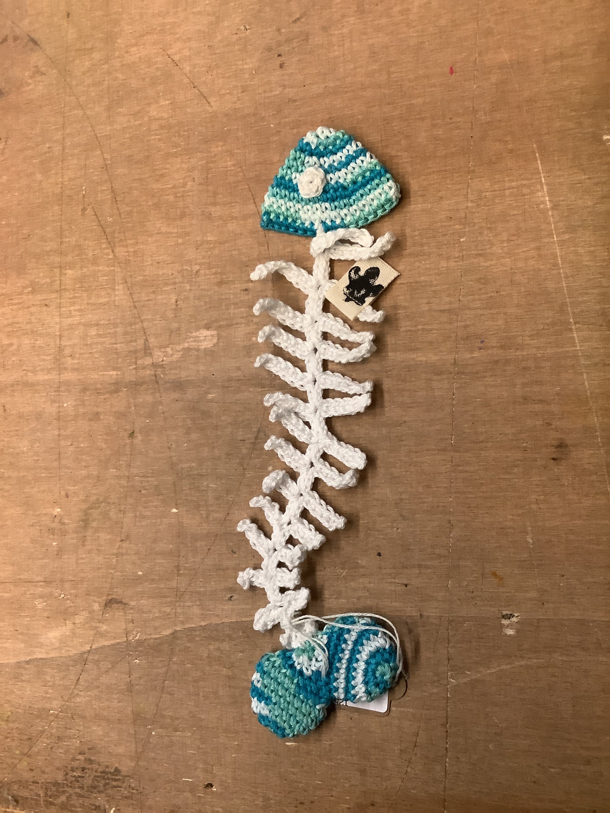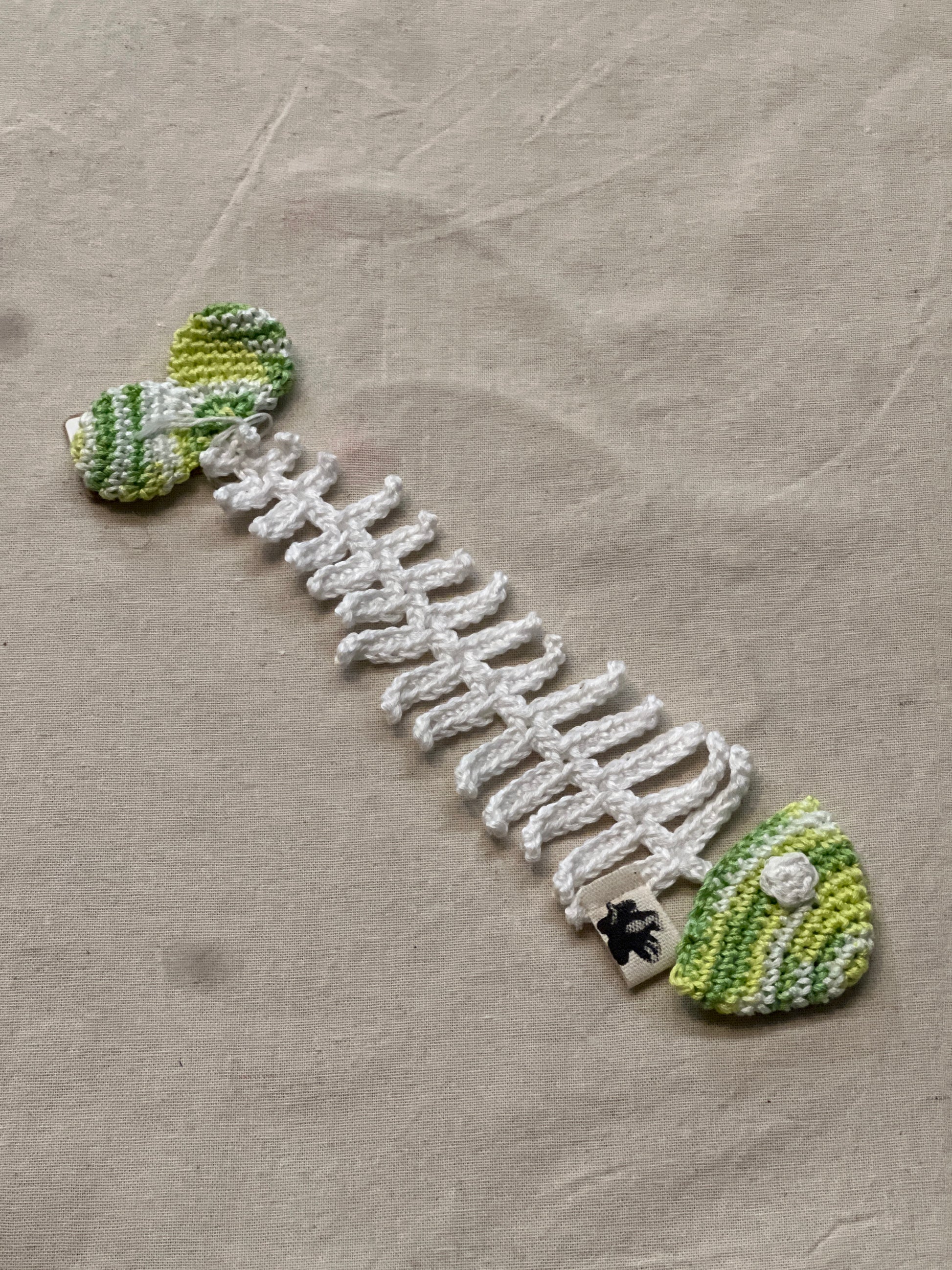 Segnalibro a uncinetto raffigurante una lisca di pesce, disponibile in diversi colori. Realizzato a mano con materiali misti. Perfetto per aggiungere un tocco unico e creativo alla lettura.