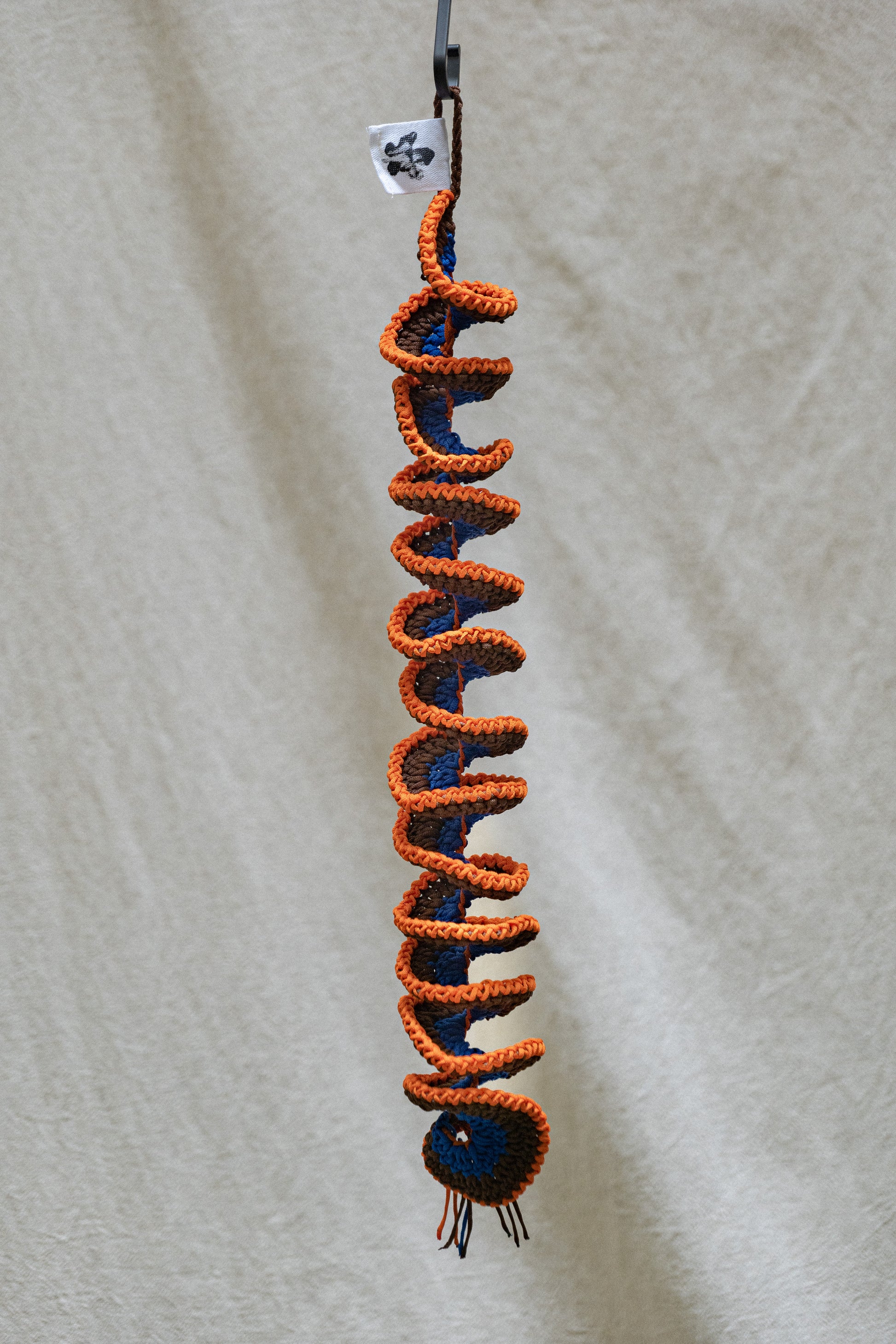 Spirale a uncinetto in poliestere, con colori arancio e marrone, lunghezza 45 cm. Ideale per creare un'atmosfera calda e accogliente.