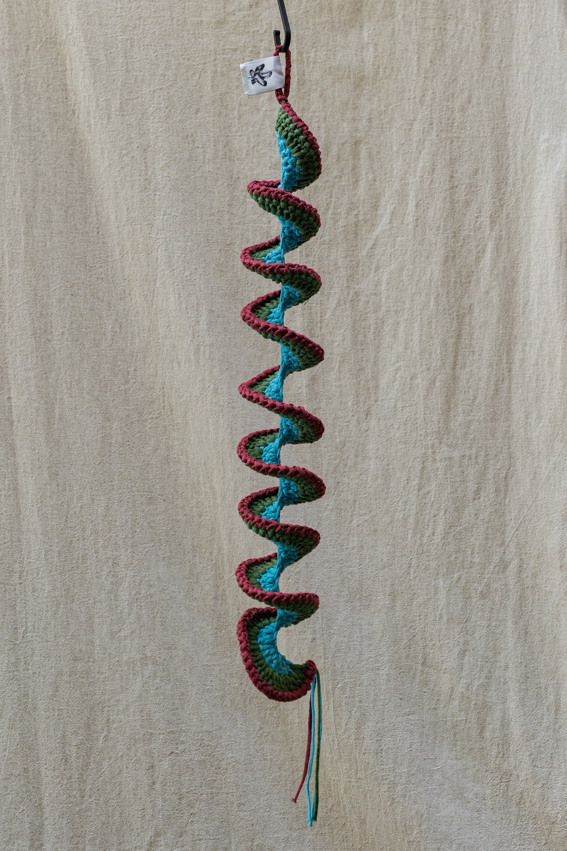 Spirale all'uncinetto in cotone, di colori azzurro e bordeaux, lunghezza 65 cm. Un accessorio elegante per decorare porte e finestre.